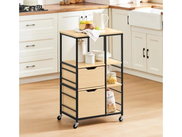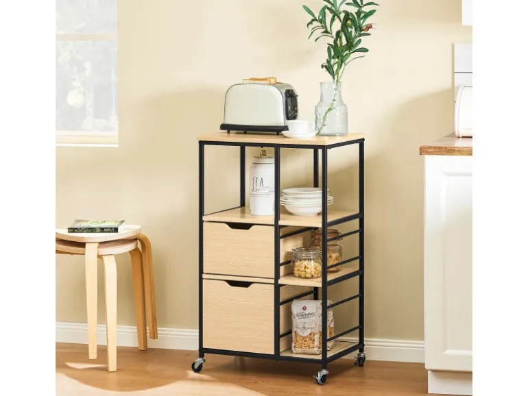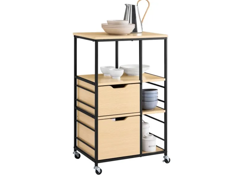 Ausgestattet ist dieser praktische Küchenwagen mit zwei großen Schubladen und drei offenen Ablagen, in denen Sie viele Utensilien verstauen können.