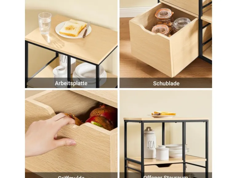 Metallstreben geben Stabilität, offene Ablagen bieten schnellen Zugriff auf Utensilien.