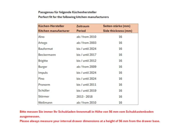 Breite: 419 mm / Tiefe: 473 mm (50 cm Schrank) gemessen in der Schubkasten Innenhöhe von 56 mm. BITTE MESSEN SIE IMMER Ihr Schubladeninnemaß und vergleichen Sie dieses mit den hier angegebenen Abmessungen! Verschiedene Küchenhersteller nutzen verschiedene Schubladensysteme. Daher ergeben sich unterschiedliche Innenmaße.
