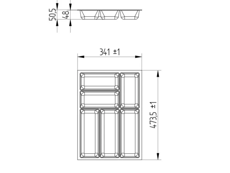 Das Innenmaß der Schublade muss in Höhe von 48 mm eine Breite 341 ± 1 mm betragen! Die Schublade muss eine Tiefe von 473 ± 1 mm (Innenmaß) haben.