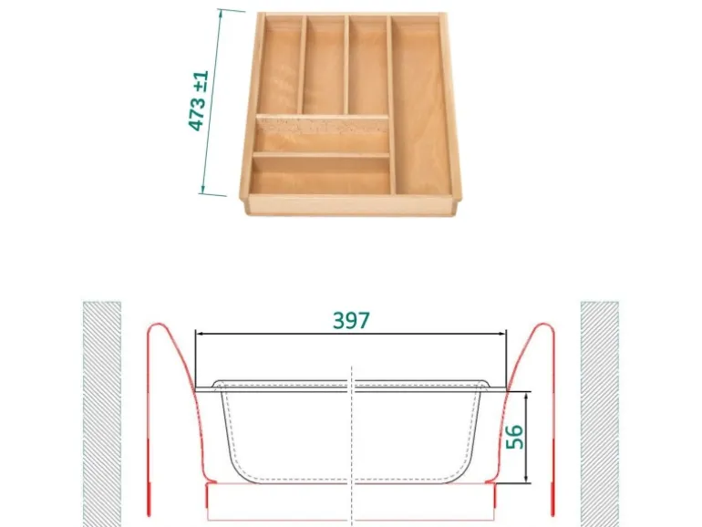 Tiefe 473 +/- 1 mm, Breite 397 +/- 1 mm, Höhe 56 +/- 1 mm – Bitte messen Sie Ihr Schubladen-Innenmaß