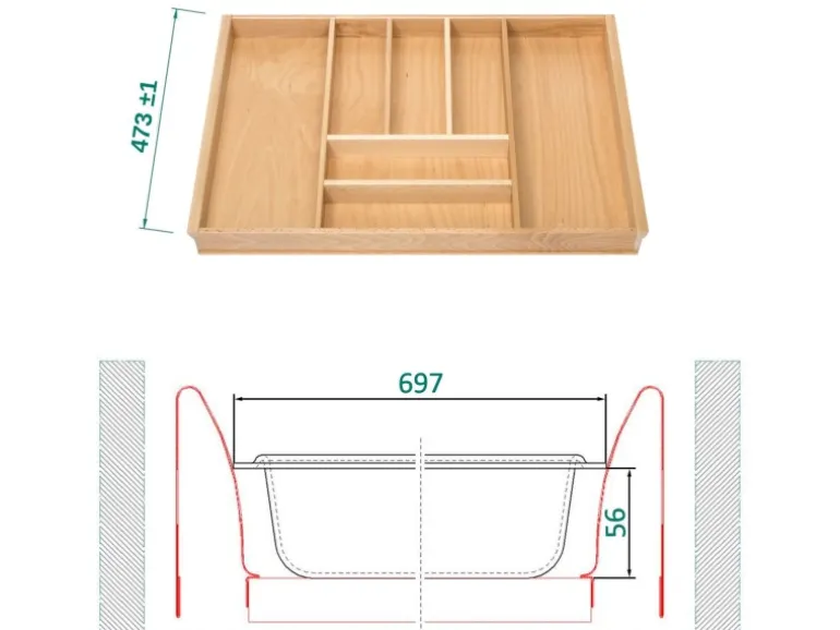 Tiefe 473 +/- 1 mm, Breite 697 +/- 1 mm, Höhe 56 +/- 1 mm – Bitte messen Sie Ihr Schubladen-Innenmaß