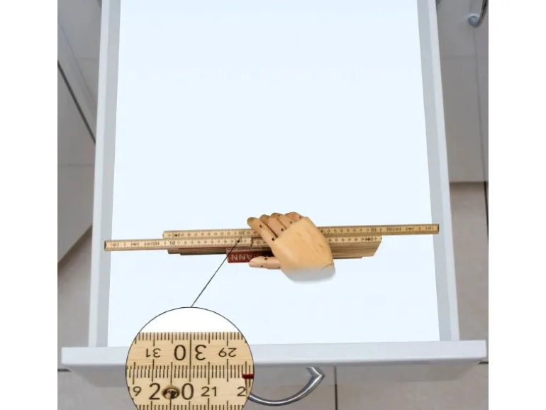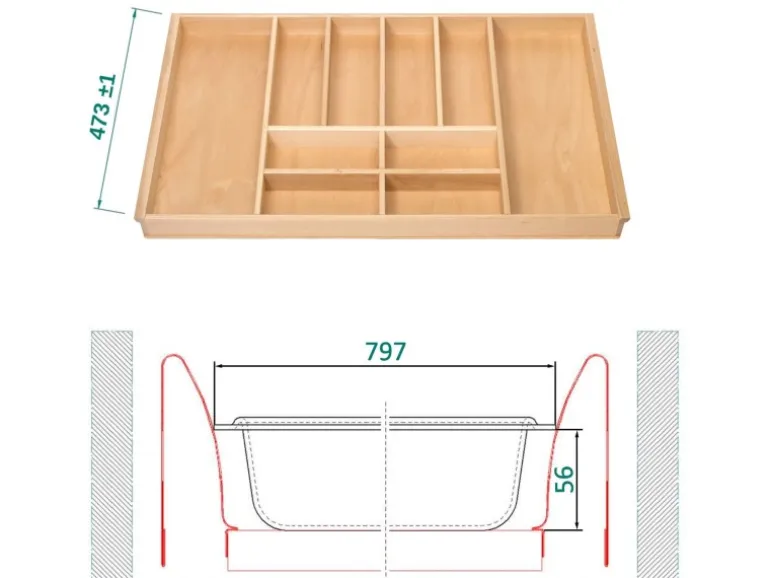 Tiefe 473 +/- 1 mm, Breite 797 +/- 1 mm, Höhe 56 +/- 1 mm – Bitte messen Sie Ihr Schubladen-Innenmaß
