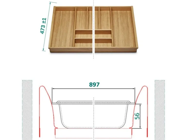 Tiefe 473 +/- 1 mm, Breite 897 +/- 1 mm, Höhe 56 +/- 1 mm – Bitte messen Sie Ihr Schubladen-Innenmaß
