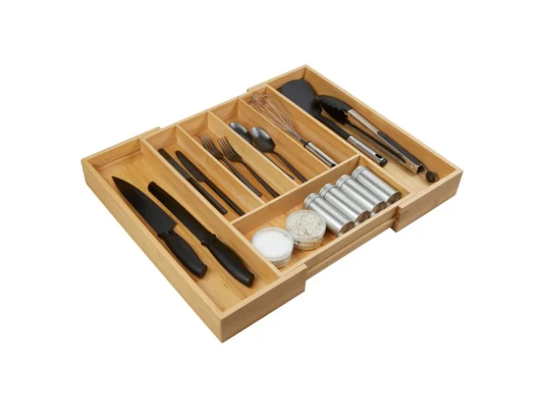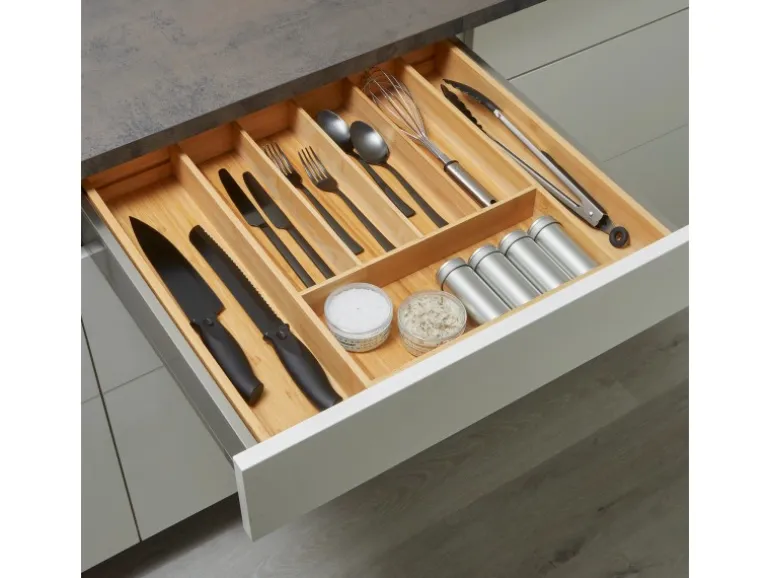 Die ORGA-BOX ist ein wahres Organisationswunder. Sie verfügt über zahlreiche Fächer, die Ihnen dabei helfen, Küchenutensilien, Büroartikel oder persönliche Gegenstände ordentlich zu verstauen. Durch das Ausziehen des Schubladenteilers können Sie die Fächer von 5 auf 7 erweitern, was besonders praktisch ist, um auch lange Gegenstände wie Tafelmesser oder Kochbesteck unterzubringen.
