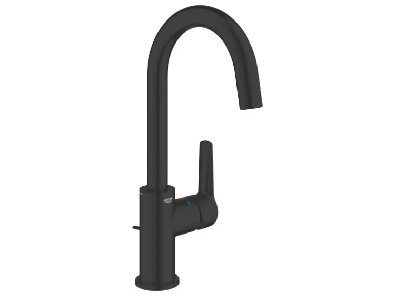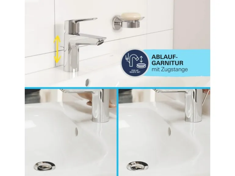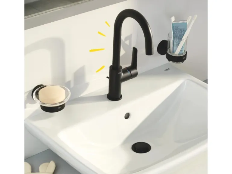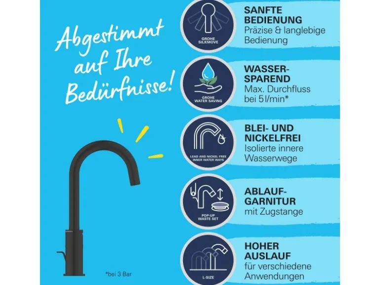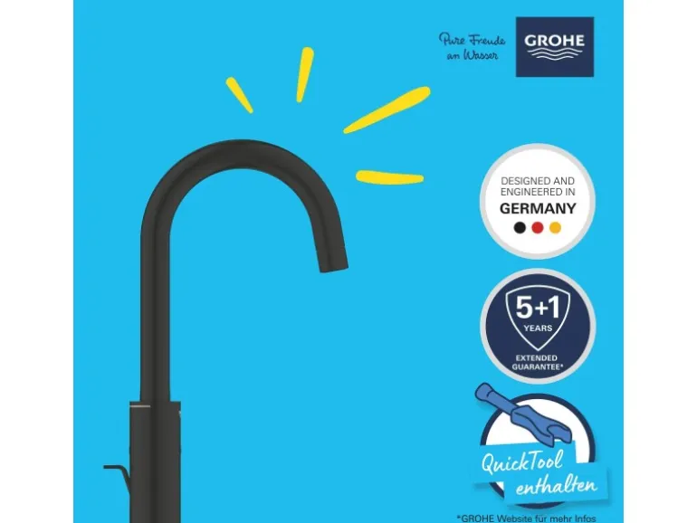 Wir haben unsere – bei den Kunden so beliebte – Grohe QuickFix Kollektion Grohe Start weiter optimiert. Sie lässt sich jetzt noch komfortabler bedienen und noch schneller installieren. Wir haben Form, Funktion und Finish dieser Armatur modernisiert, damit sie sich perfekt in zeitgemäße Badezimmerkonzepte einfügt. Die neue Grohe Start Waschtischarmatur der Größe L in Matt Black macht das Waschen zum Vergnügen. Mit ihrem schlanken Design wird sie in jedem modernen Badezimmer zum Mittelpunkt und Blickfang. Mit dem hohen schwenkbaren Auslauf haben Sie mehr Platz und Flexibilität. Die langlebige Grohe SilkMove Keramikkartusche im Inneren gewährleistet über den Massivmetallhebel die leichtgängige, präzise Steuerung von Wassermenge und -temperatur. Der integrierte Temperaturbegrenzer spart Energie und die Grohe Wasserspartechnologie begrenzt den Wasserverbrauch auf 5,7 l/min – ohne Abstriche bei der Leistung. Die praktische Zugstangen-Ablaufgarnitur wird über eine kleine Stange an der Rückseite der Armatur betätigt. So lässt sich der Ablauf einfach öffnen und schließen, ohne dass Ihre Hände nass werden. Mit der robusten, pflegeleichten Grohe Long-Life Oberfläche glänzt die Badezimmerarmatur auch nach vielen Jahren im Gebrauch wie am ersten Tag.