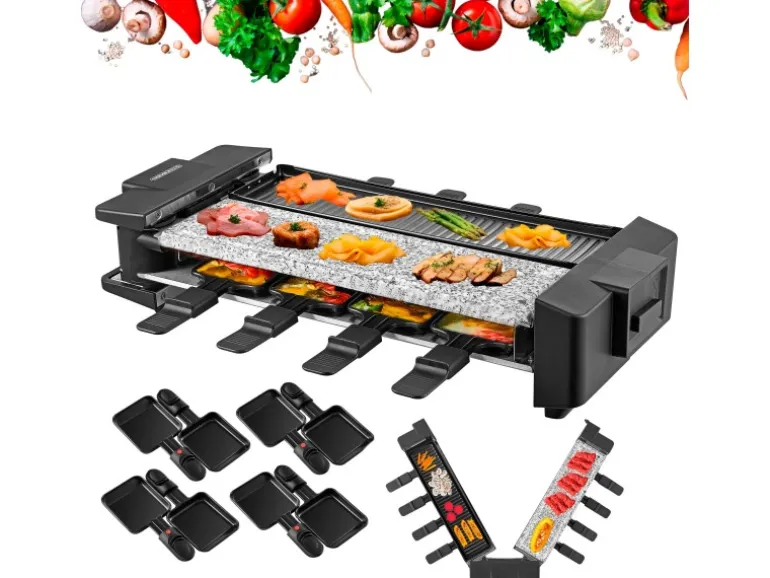 Kombinierter Raclette-Grill mit zwei verschiedenen Grillflächen und 8 Pfannen.
