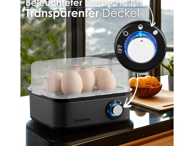 Sicherheit und Komfort Dampfauslass im Deckel: Der transparente Deckel ist mit einem Dampfauslass ausgestattet, der den Druck während des Kochens reguliert und für eine sichere Zubereitung sorgt. Überhitzungsschutz: Dank der integrierten Sicherheitsfunktion schaltet sich das Gerät bei Überhitzung automatisch ab. Signalton: Sobald die Eier fertig sind, ertönt ein Signalton, der Sie sofort informiert. Keine Sorge mehr über zu lang gekochte Eier!