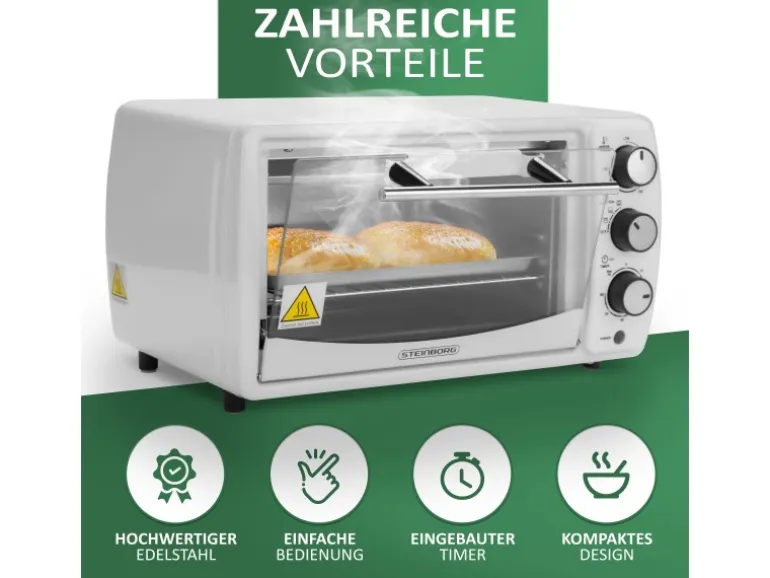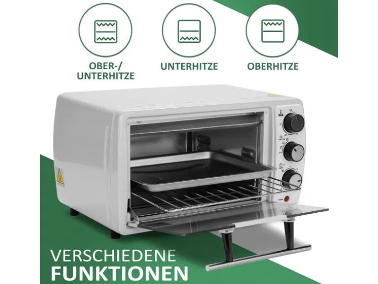 Kompaktes Design, einfache Bedienung, 1200 Watt und viele Extras wie Ober- und Unterhitze, eine stufenlose Temperatur-Einstellung und ein eingebauter 60-Minuten-Timer zeichnen den Ofen aus.