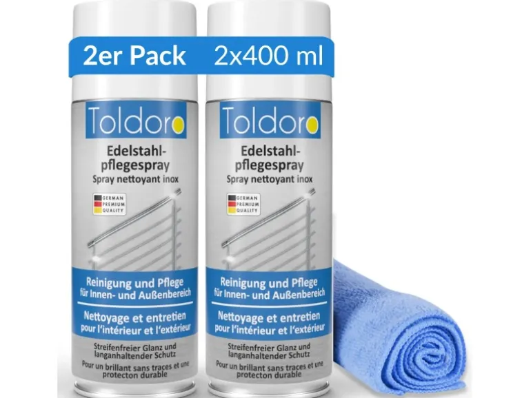 Toldoro Set 2x Edelstahl Pflegespray 400ml Edelstahlreiniger für Küche oder Grill Edelstahlpflege Spray als Reinigungsmittel oder Metallreiniger
