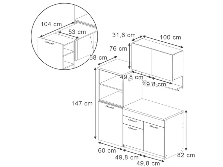 Der Küchenblock hat eine Breite von 160 cm, eine Höhe von 147 cm und eine Tiefe von 58 cm