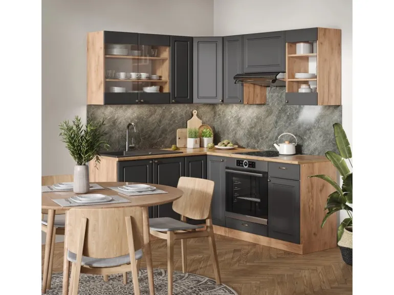 Die Winkelküche besteht aus pflegeleichter Spanplatte 16 mm, mit einer Melaminharzbeschichtung
