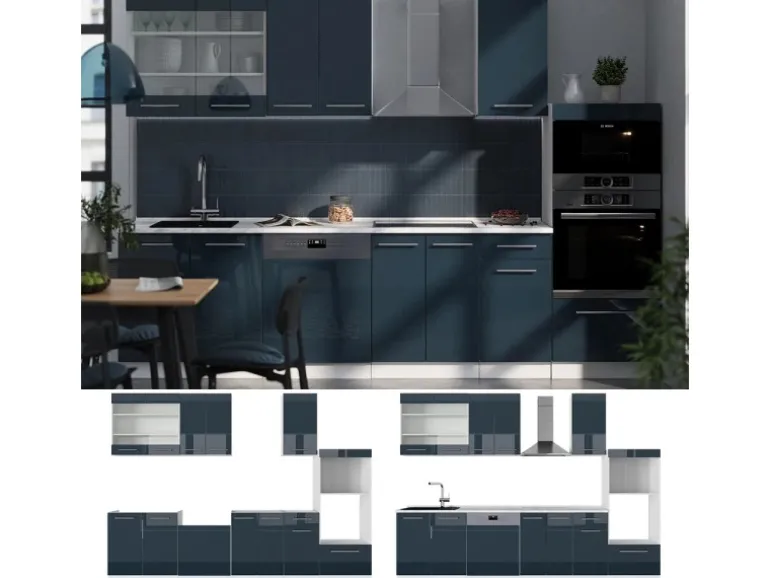 Das Küchenmöbel hat eine Breite von 300 cm, eine Höhe von 82 cm und eine Tiefe von 60 cm