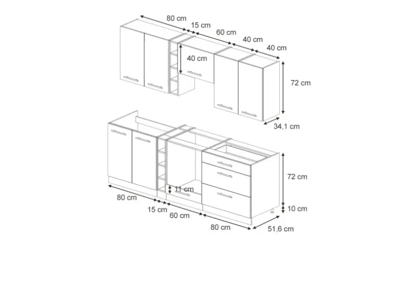 Das Küchenmöbel hat eine Breite von 235 cm, eine Höhe von 82 cm und eine Tiefe von 52 cm