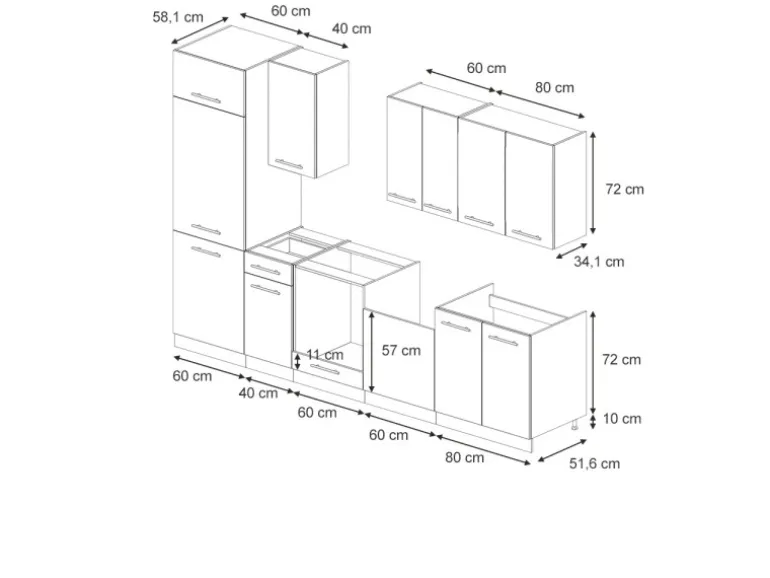Die Einbauküche hat eine Breite von 300 cm, eine Höhe von 82 cm und eine Tiefe von 52 cm
