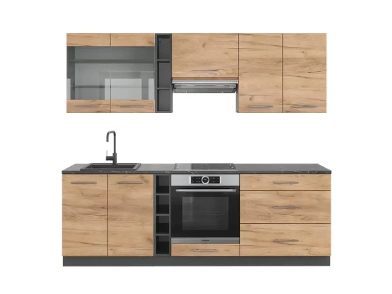 Das Küchenmöbel hat eine Breite von 235 cm, eine Höhe von 82 cm und eine Tiefe von 52 cm