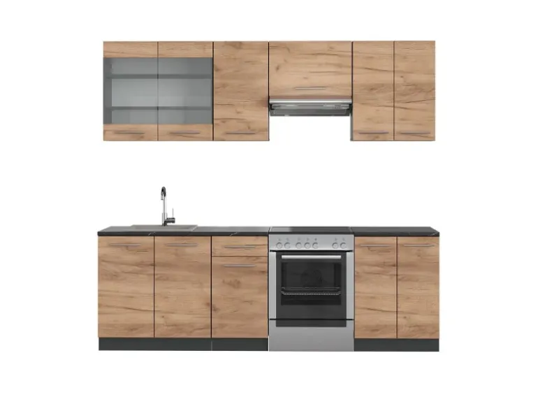 Das Küchenmöbel hat eine Breite von 240 cm, eine Höhe von 82 cm und eine Tiefe von 52 cm