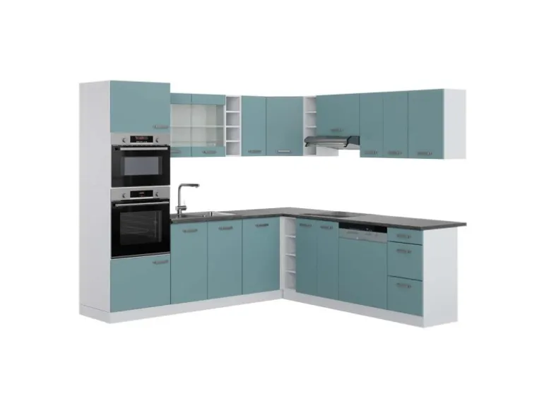 Die Winkelküche mit Arbeitsplatte hat eine Breite 247 cm, eine Höhe 206,8 cm und eine Länge 237 cm
