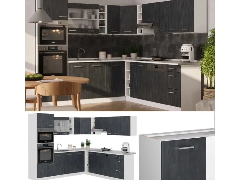 Die Eckküche mit Arbeitsplatte hat eine Breite 247 cm, eine Höhe 206,8 cm und eine Länge 237 cm