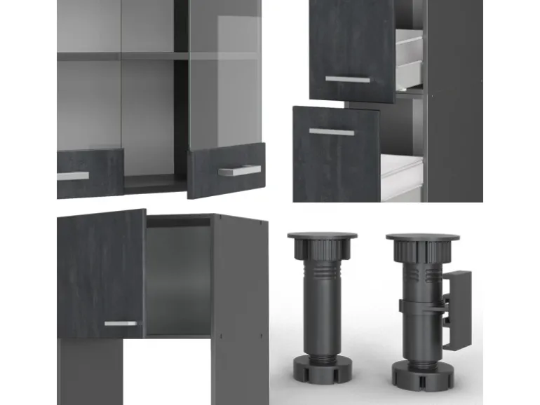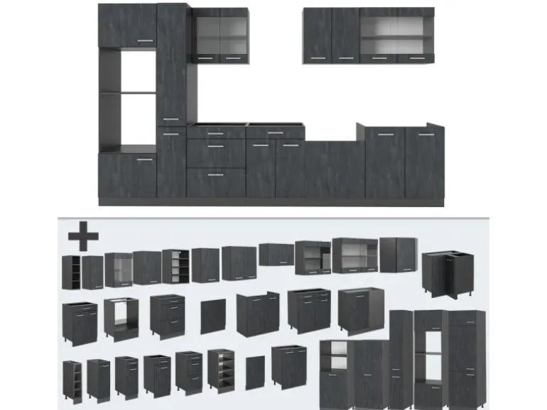 LIEFERUMFANG: Küchenzeile als Bausatz, 4 Arbeitsplatten, Montageanleitung, Montagematerial.