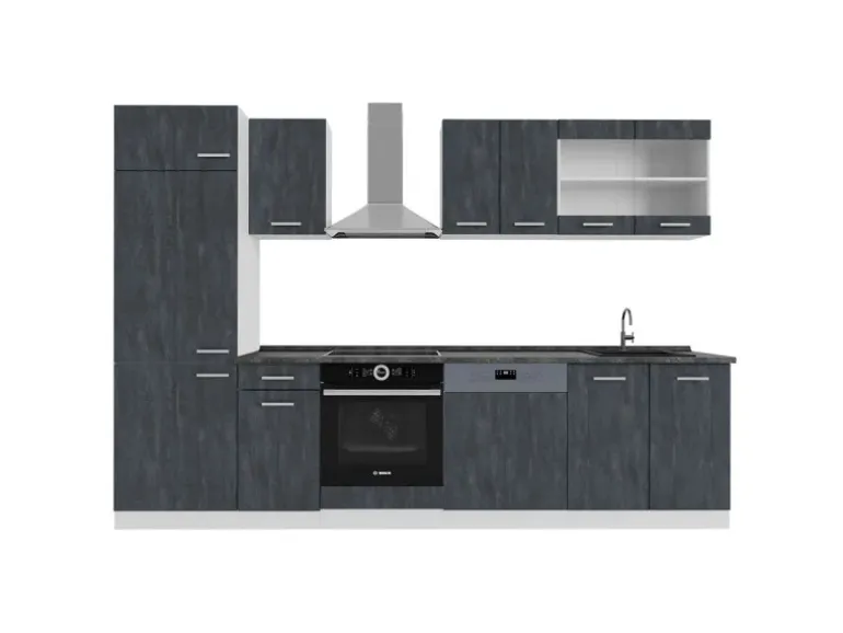 Die Einbauküche mit Arbeitsplatte hat eine Breite 300 cm, eine Höhe 206,8 cm und eine Tiefe 57,2 cm