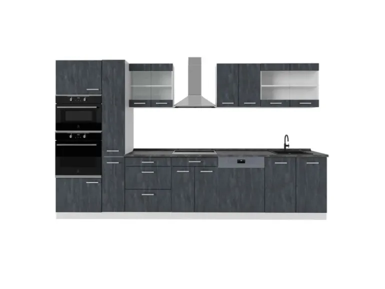 Die Einbauküche hat eine Breite von 350 cm, eine Höhe von 206,8 cm und eine Tiefe von 60 cm