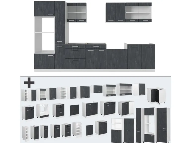 LIEFERUMFANG: Küchenzeile als Bausatz, 4 Arbeitsplatten, Montageanleitung, Montagematerial.