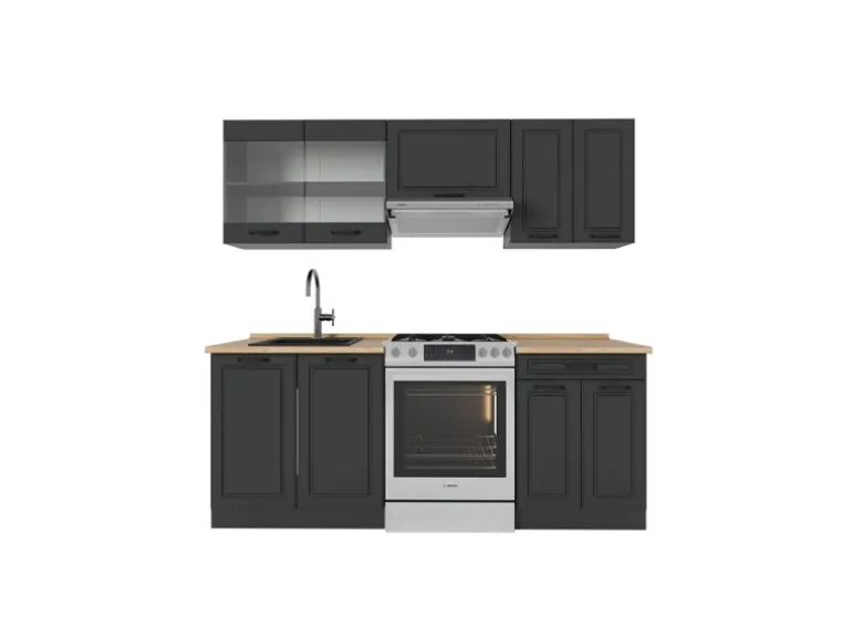 Das Küchenmöbel hat eine Breite von 200 cm, eine Höhe von 82 cm und eine Tiefe von 46 cm