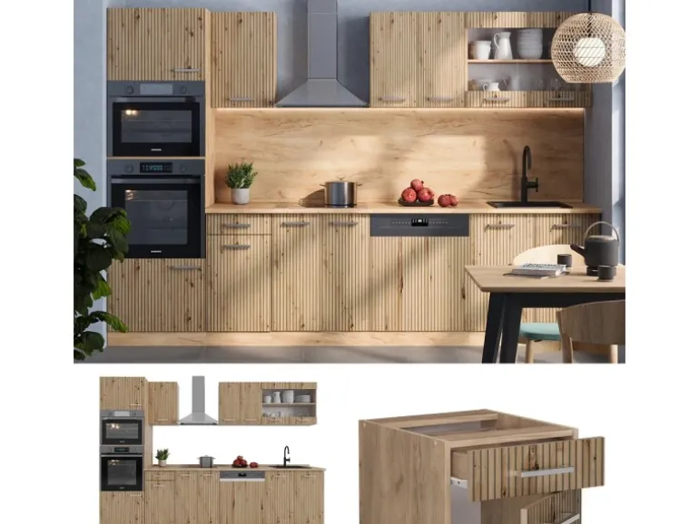 Das Küchenmöbel hat eine Breite von 300 cm, eine Höhe von 207 cm und eine Tiefe von 60 cm