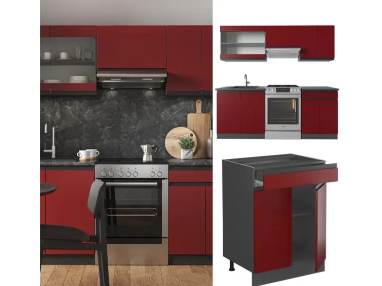 Das Küchenmöbel hat eine Breite von 200 cm, eine Höhe von 82 cm und eine Tiefe von 60 cm