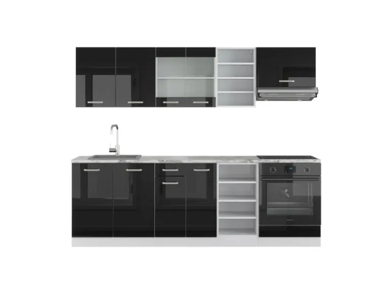 Die Küchenzeile hat eine Breite von 240 cm, eine Höhe von 81,6 cm und eine Tiefe von 46 cm