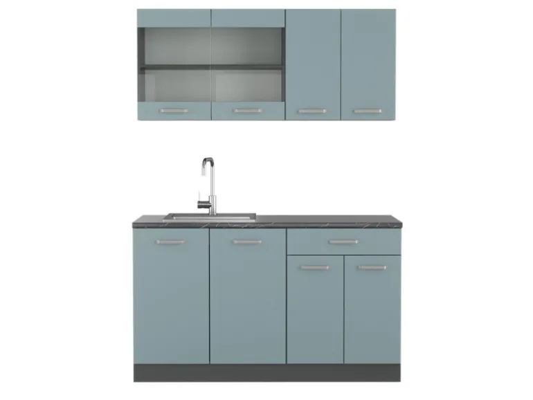 Die Küchenzeile hat eine Breite von 140 cm, eine Höhe von 81,6 cm und eine Tiefe von 46 cm