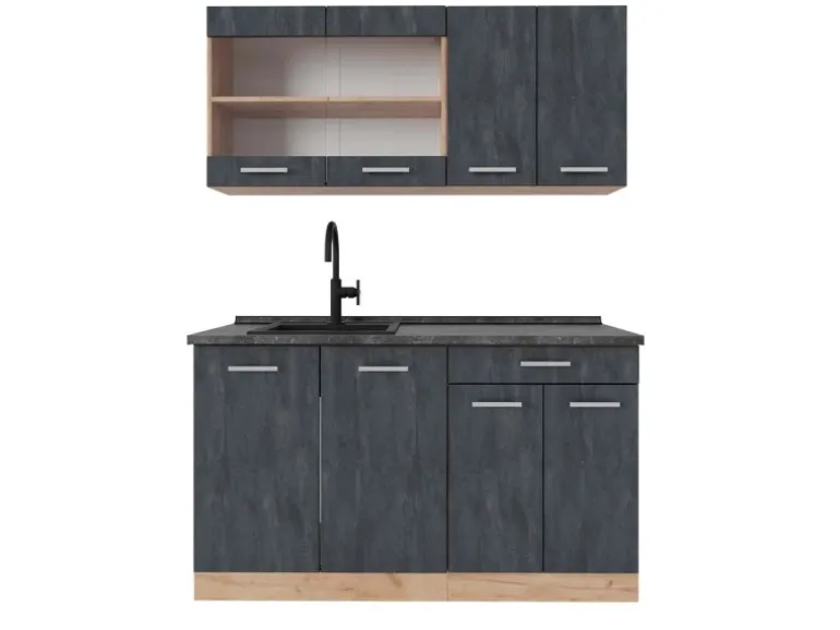 Die Singleküche mit Arbeitsplatte hat eine Breite 140 cm, eine Höhe 81,6 cm und eine Tiefe 60 cm