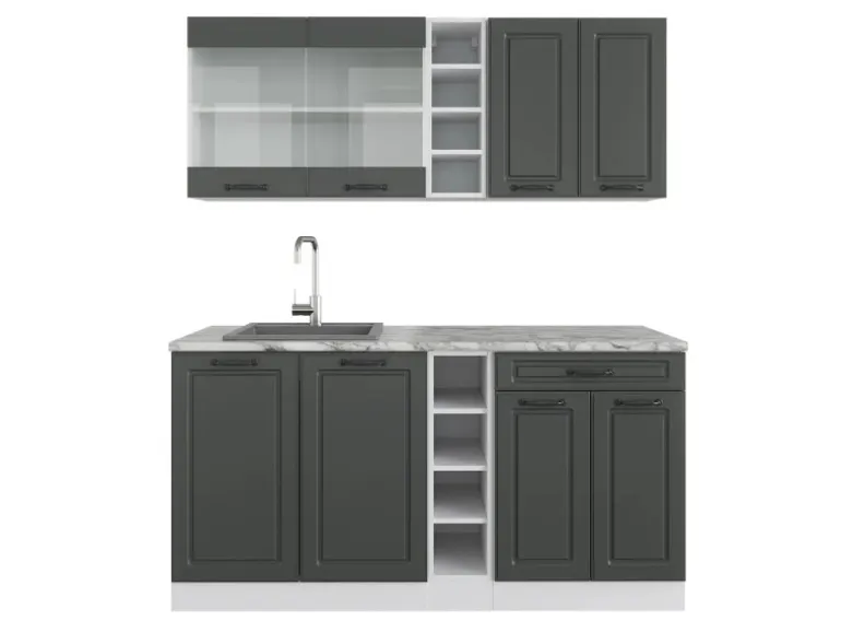 Der Küchenblock hat eine Breite von 160 cm, eine Höhe von 81,6 cm und eine Tiefe von 60 cm