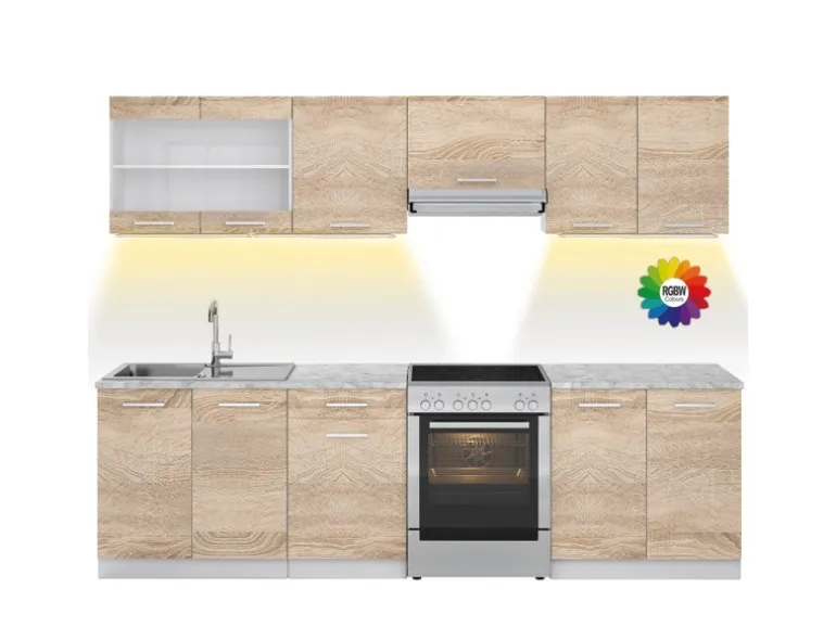 LIEFERUMFANG: Küchenblock mit Arbeitsplatte, LED-Leisten, Montagematerial, Montageanleitung.