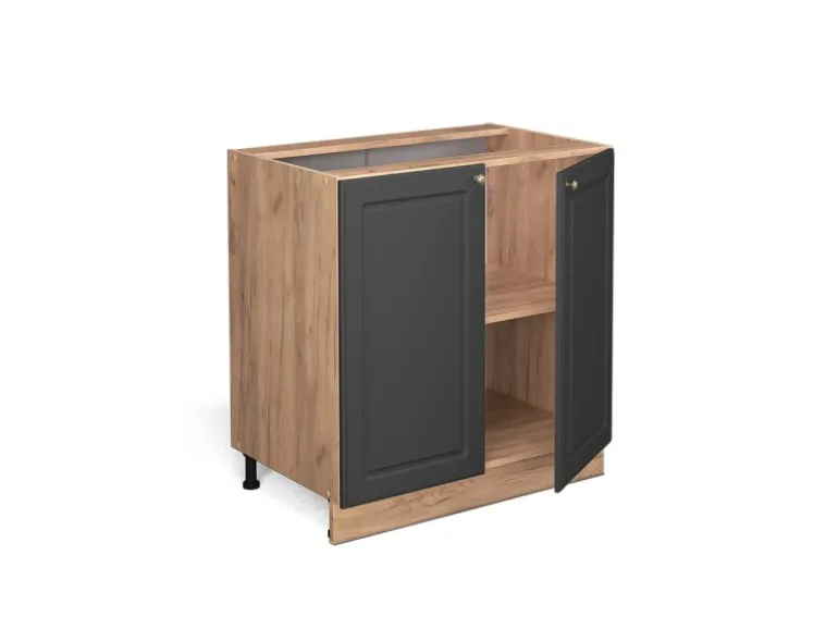 Der Spülenschrank hat Breite 80 cm, Höhe 82 cm und Tiefe 60 cm
