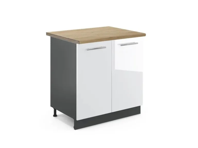 Der Spülenschrank hat Breite 80 cm, Höhe 82 cm und Tiefe 60 cm