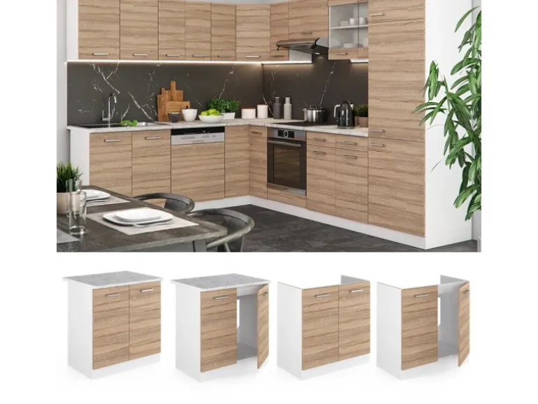 Der Spülenschrank hat Breite 80 cm, Höhe 81,6 cm und Tiefe 60 cm