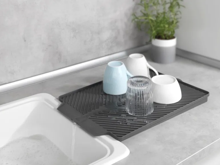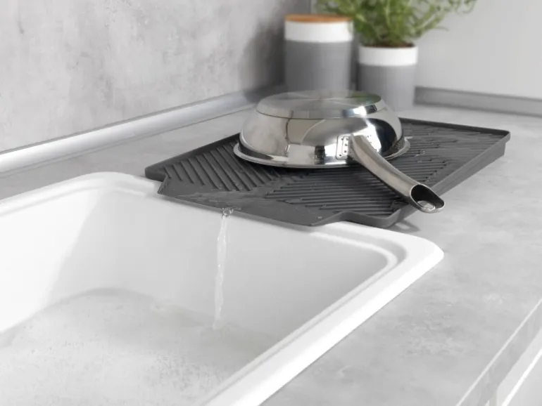 Upgrade für Ihre Küche: Mit der Wenko Abtropfmatte Linea 40 cm x 3 cm x 30 cm Grau trocknet das Geschirr und Besteck ohne Kalkränder und Wasserflecken. Zudem werden lästige Kratzer auf der Spülablage und Gläsern vermieden sowie das Spülbecken seitlich im Handumdrehen erweitert. Das nasse Geschirr wird einfach nach dem Abwasch auf die Geschirrmatte gelegt. Durch die geneigte Fläche fließt das Spülwasser optimal ab. So verhindern Sie Pfützen auf der Ablagefläche und Kalkränder an Gläsern. Das Spülgut trocknet schneller. Die praktische Geschirr-Abtropfmatte ist aus robustem Kunststoff (TPR) gefertigt und im trendigen Grau gehalten. Natürlich bietet Wenko noch viele weitere clevere Küchenhelfer im passenden Grau an. Dieser Look macht die Küche zum wahren Wohlfühlort.