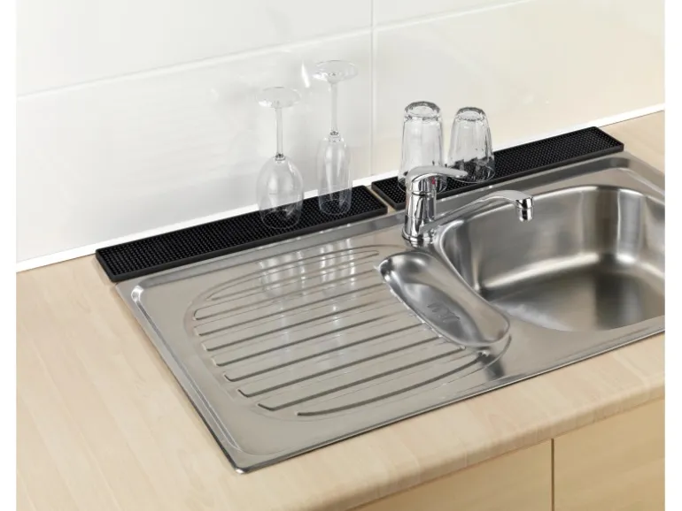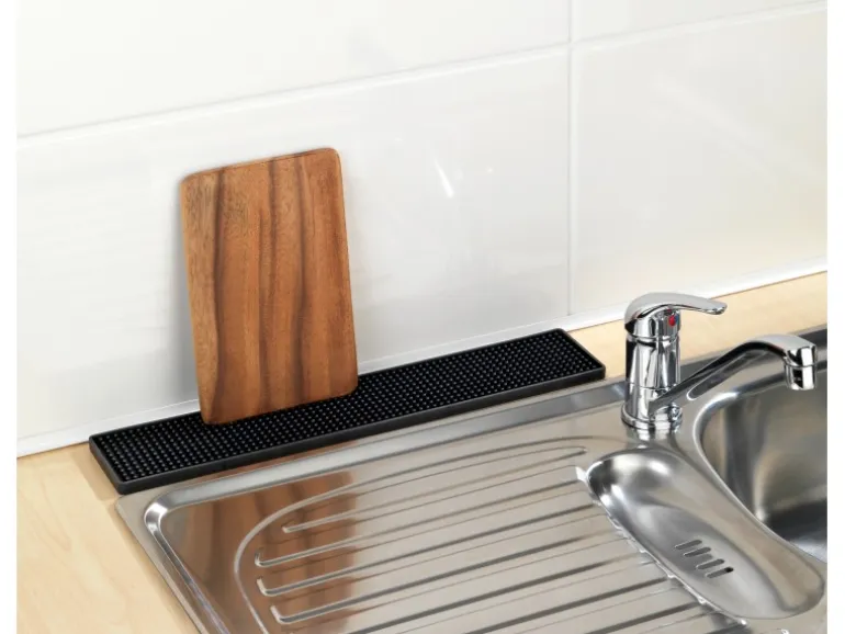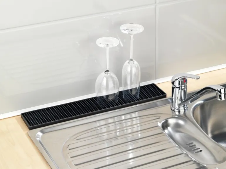 Die hochwertige Abtropfmatte Slim ist ein idealer und praktischer Helfer in der Küche. Durch ihre robuste Qualität schont sie den hochwertigen Untergrund vor hässlichen Kratzern und das Verrutschen des Geschirrs. Tassen und Gläser, Geschirr, Besteck oder Töpfe werden sanft und sicher zum Trocknen auf der weichen Oberfläche gelagert. Die Matte besticht durch ihre hochwertige, schwarze Optik kombiniert mit optimaler Wasser-Ablaufqualität. Durch ihre schlanke Form passt die Geschirrmatte optimal neben die Spüle oder zwischen Spüle und Wand, wodurch die Matte auch ideal zum Abtropfen von Brettchen geeinigt ist.