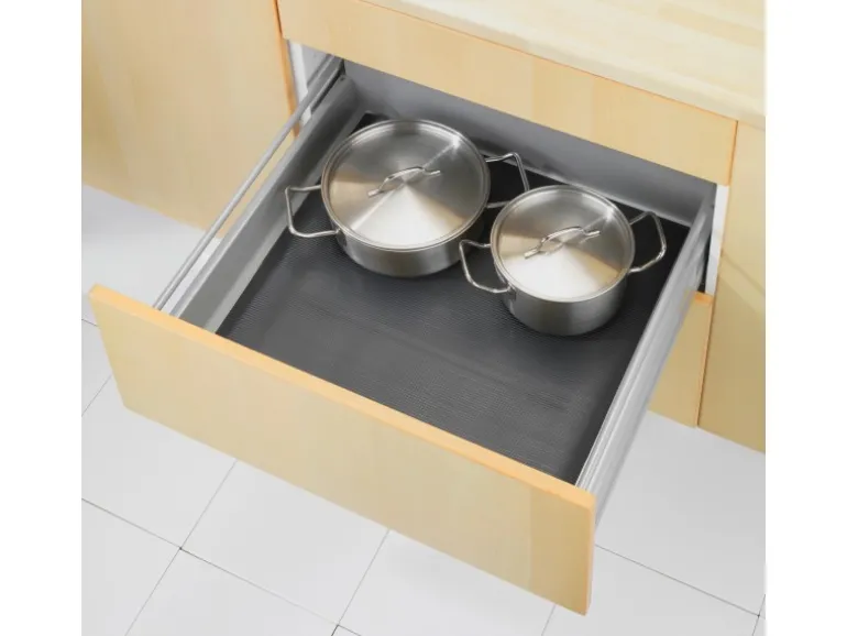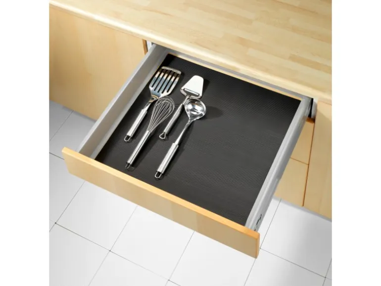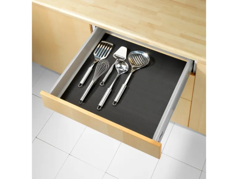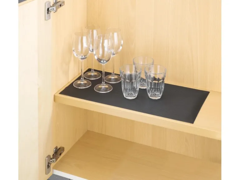 Idealer Rutschstopp für alle Schränke und Schubladen: die Anti-Rutsch-Matte. Die praktische Matte sorgt für sicheren Stand von Gläsern, Töpfen und Kleinteilen. Alles kann sicher und funktional verstaut werden. Zudem wirkt die Matte geräuschdämpfend. Sie kann auf jede beliebige Länge und Breite zugeschnitten werden und bringt mit dem klassischem Schwarz Eleganz in jede Küchenschublade. Die Anti-Rutsch-Matte mit Rillen ist aus strapazierfähigem Kunststoff gefertigt.