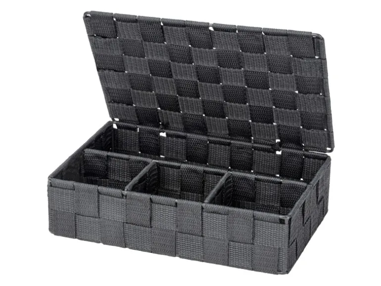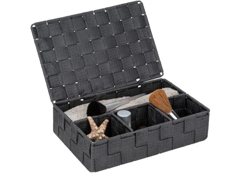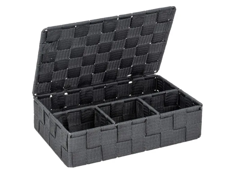 Ordnung macht Laune: Der schöne Korb Adria Klein mit Deckel bringt in seinem angesagten, minimalistischen Dunkelgrau neue Optik in den gesamten Haushalt. Die praktische, längliche Aufteilung mit drei kleinen und einem größeren Fach garantiert eine übersichtliche Aufbewahrung aller Utensilien. Im Badezimmer sorgt der Korb aus hochwertigem Kunststoff-Geflecht (Polypropylen) für Stil und Ordnung bei der Aufbewahrung von Bad-Accessoires, Bürsten oder Haarklammern. Kosmetik & Co. verschwinden einfach im Korb! Im Kinderzimmer können kleine Spielzeugteile übersichtlich gesammelt werden. Auch in Kleiderschränken hilft die dekorative Box, Schmuck, Wäsche oder Socken geordnet zu lagern. Und in der Küche finden kleine Küchenutensilien, Stifte, Blätter und vieles mehr einen attraktiven Platz. Mit dem praktischen Deckel ist der Inhalt des Aufbewahrungskorbs immer vor unerwünschten Blicken geschützt! So werden alle Utensilien diskret und sicher aufbewahrt. Wie wäre es mit noch mehr Ordnung? Die praktischen Körbe von Wenko sind stapelbar und können so platzsparend aufbewahrt werden.