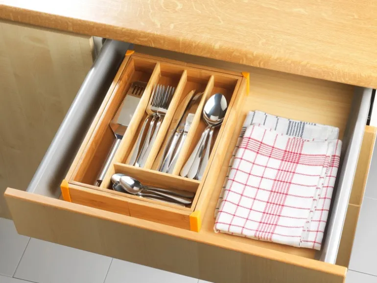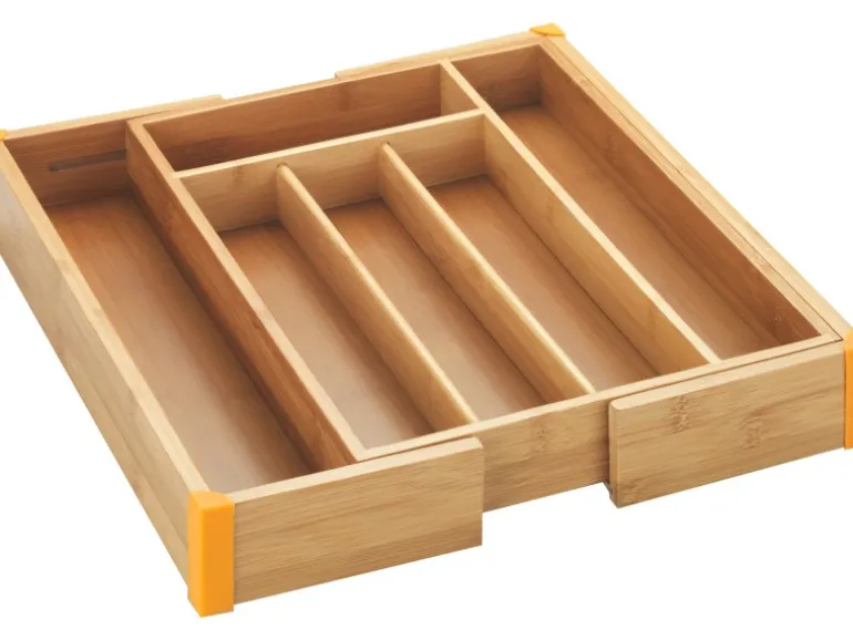 Mühelos lässt er sich beidseitig ausziehen (von 25,7 bis 38,5 cm) und passt sich so ganz einfach jeder Schublade an. Dabei ermöglicht der Besteck-Kasten in fünf bis sieben separaten Fächern verschiedener Größen die übersichtliche, getrennte Aufbewahrung von Messern, Gabeln, Löffeln, Teelöffeln oder Küchenmessern. So ist das Besteck stets vorsortiert und griffbereit verfügbar.