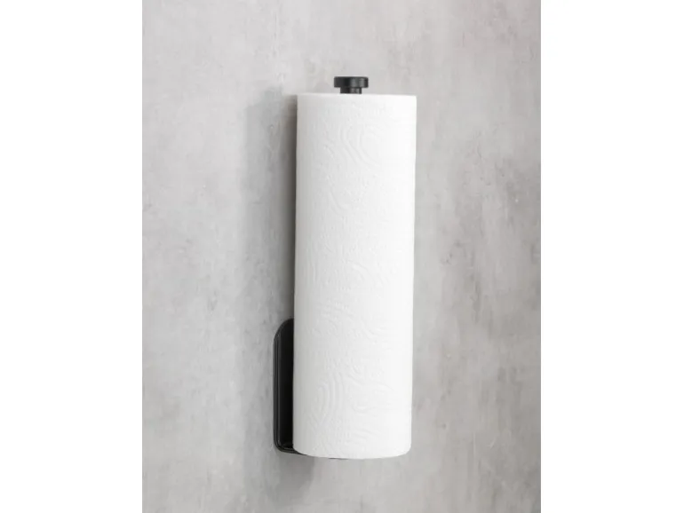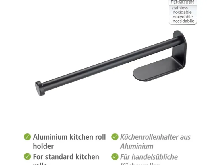 Der Küchenrollenhalter besteht aus Aluminium. Das Material ist rostfrei und somit langlebig. Sein schlichtes Design in Schwarz macht den hängenden Halter zum unauffälligen, aber unverzichtbaren Küchenhelfer für alle, die es minimalistisch mögen. Auf den praktischen Halter mit den Maßen von (B x H x T): 27,5 x 4,5 x, 7 cm passen handelsübliche Küchenrollen, die sich ganz leicht austauschen lassen.