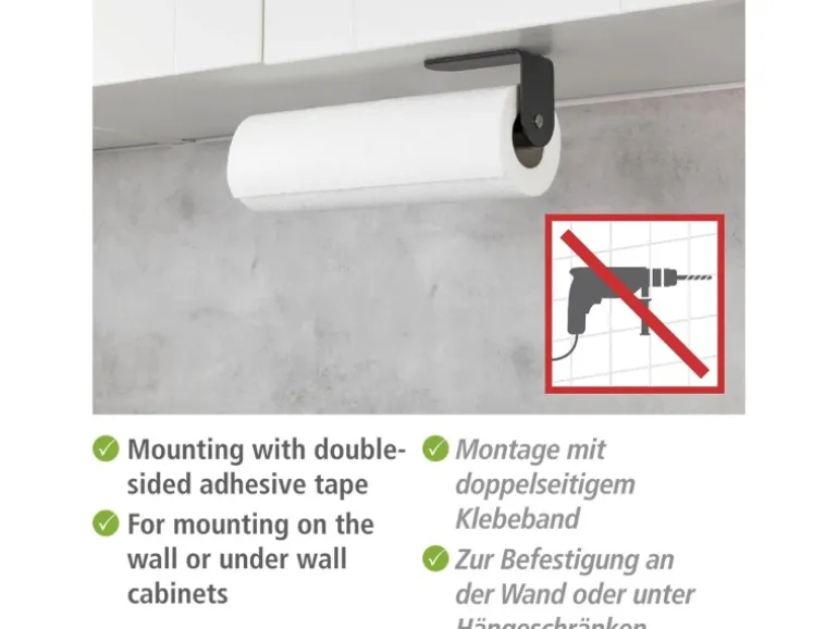 Auch unter Hängeschränken kann der Küchenrollenhalter angebracht werden und spart dort noch mehr Platz. Neben dem optischen Effekt einer schwebenden Küchenrolle wird auch das Abrollen und Abreißen der Tücher erleichtert. Außerdem ist das Küchenpapier selbst vor versehentlichen Berührungen mit Flüssigkeiten geschützt.
