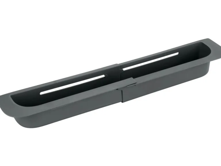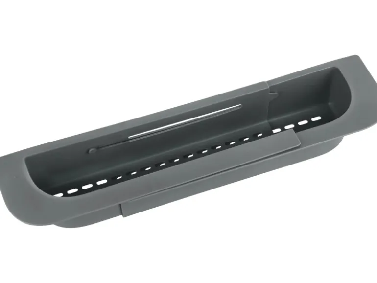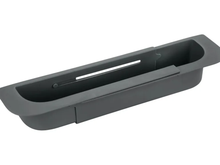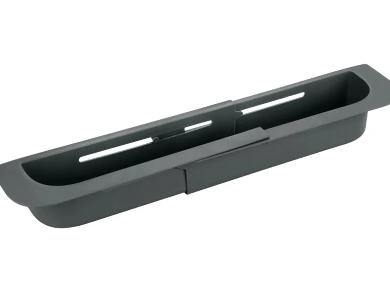 Durch seinen breiten Rand kann der Organizer in das Becken eingehängt werden. Auf bis zu 49,5 cm lässt sich der Spülhelfer flexibel ausziehen und passt sich dem Spülbecken so individuell an. Zusammengeschoben misst der schmale Organizer (B x H x T): 36 x 5,5 x 8,5 cm.