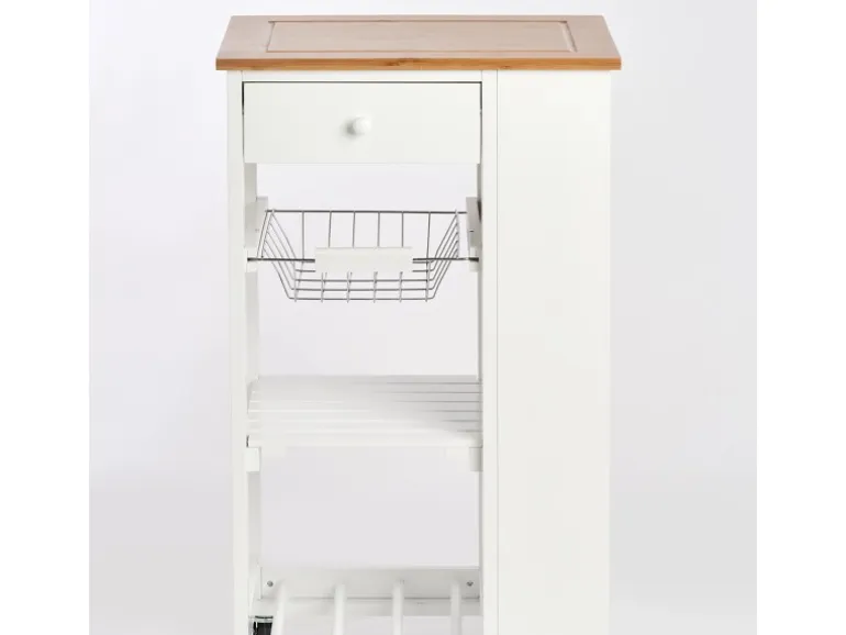 Die Flaschenablage bietet Platz für drei Flaschen Ihrer Wahl, in der oberen Schublade werden Küchenhelfer wie Schere und Co. sicher verstaut und der herausziehbare Korbeinsatz dient als perfekter Stauraum für Küchentücher. Dank seiner vier Rollen kann der Rollwagen problemlos bewegt und verschoben werden. Ein sicherer Stand ist mittels zweier Feststellbremsen dennoch gewährleistet.